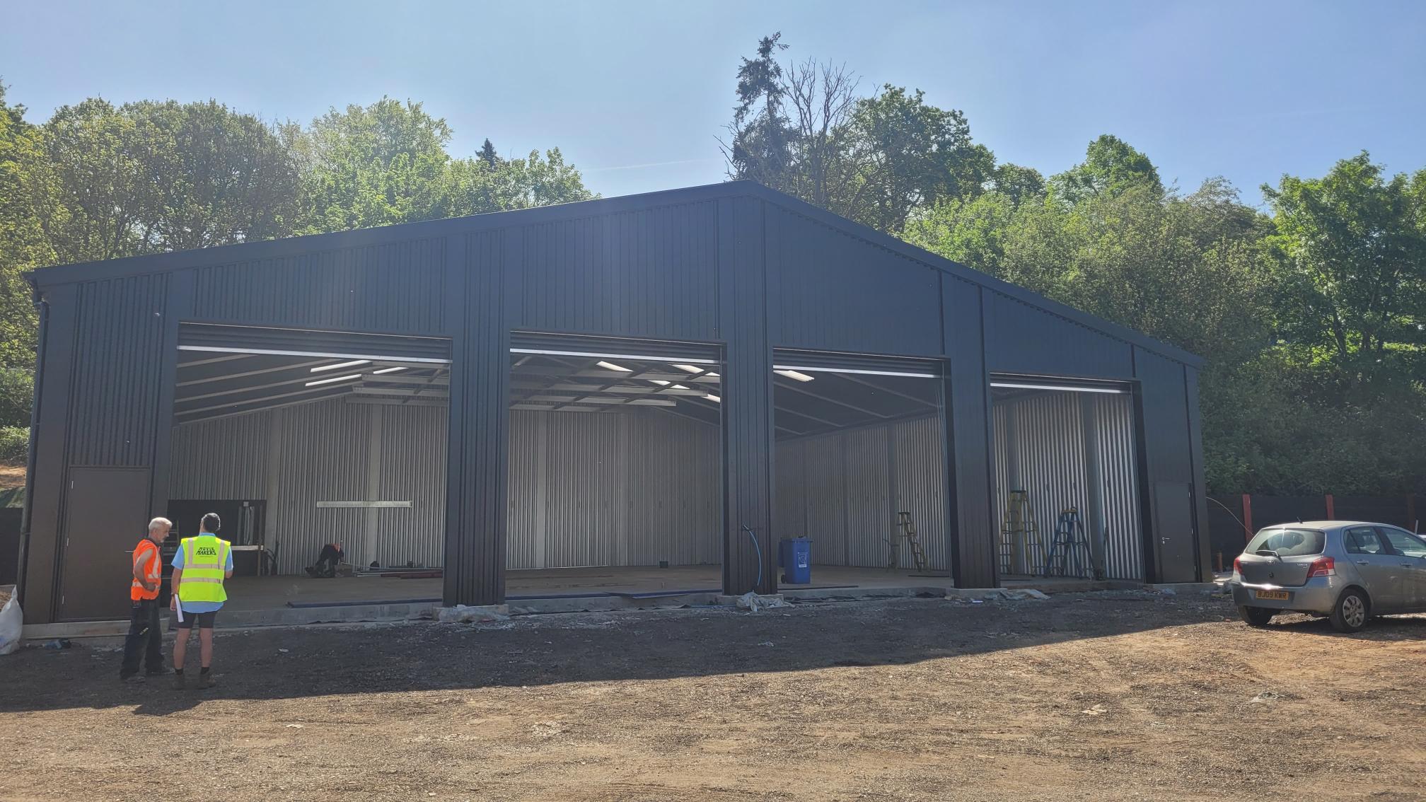 Large steel prefabricated vehicle maintenance building with four roller shutter doors to front gable elevation in Surrey, manufactured by Saredon Steel Buildings Ltd.