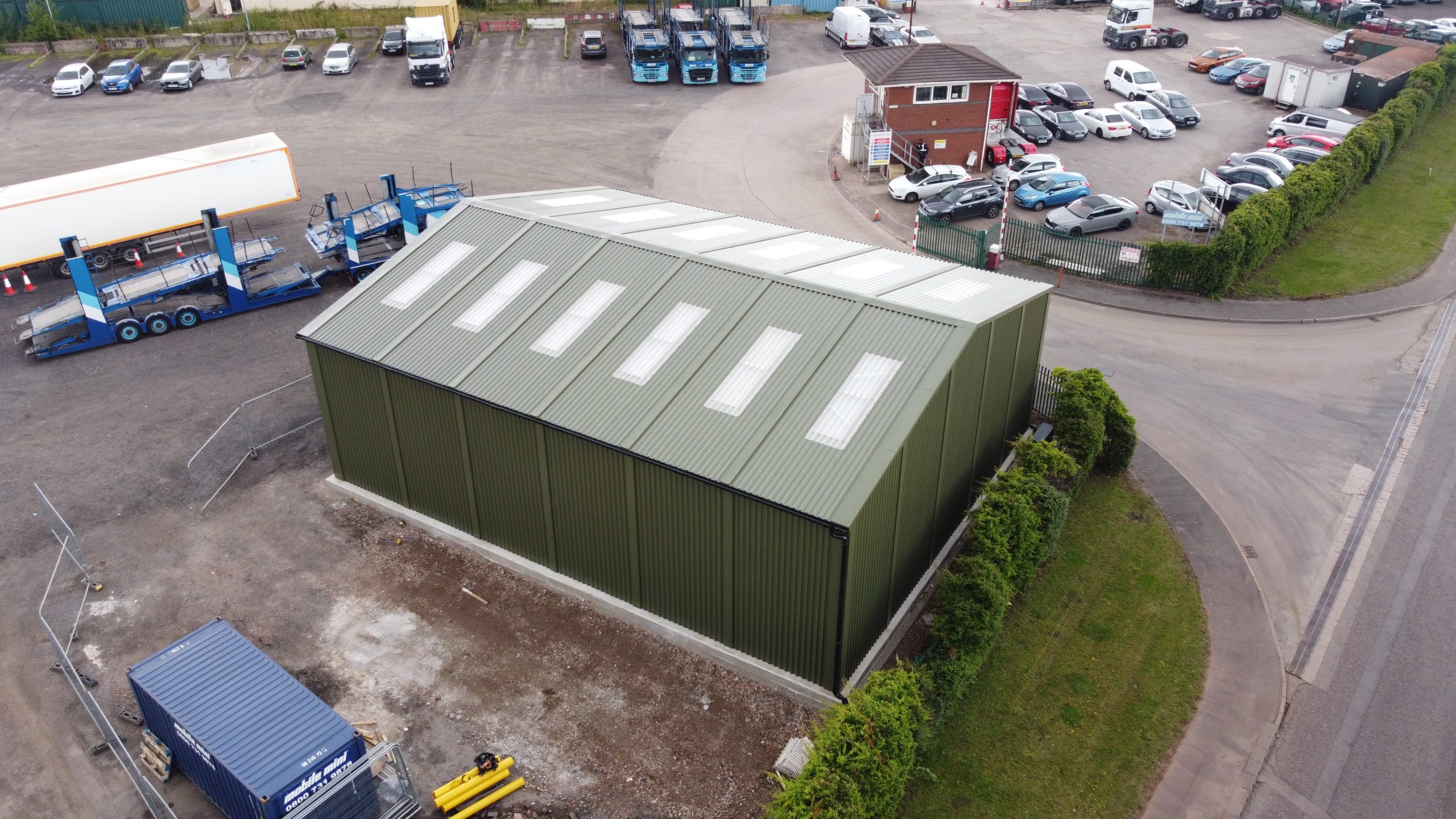 Small green prefabricated steel vehicle storage building supplied and installed in Aldridge by Saredon Steel Buildings Ltd