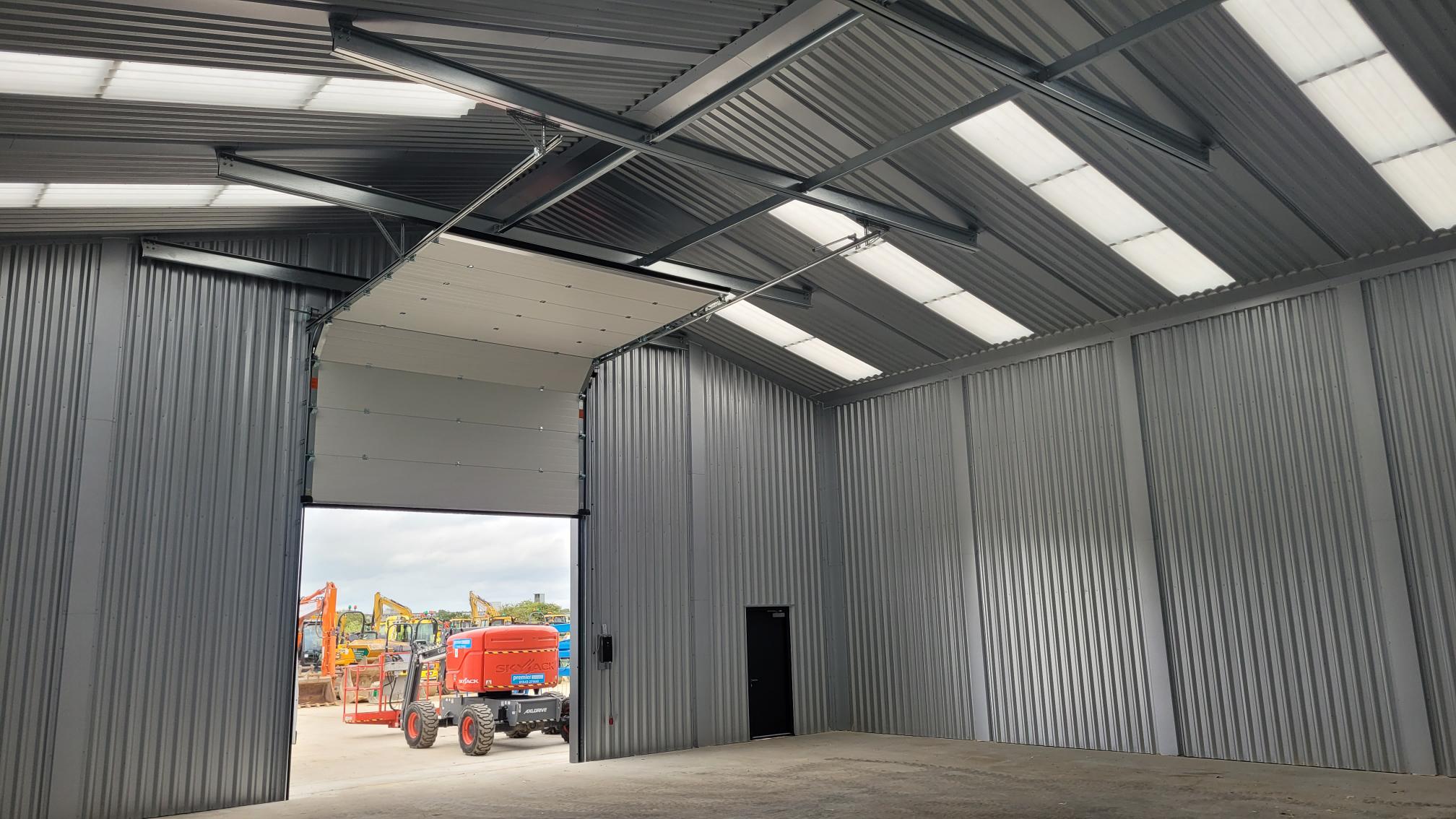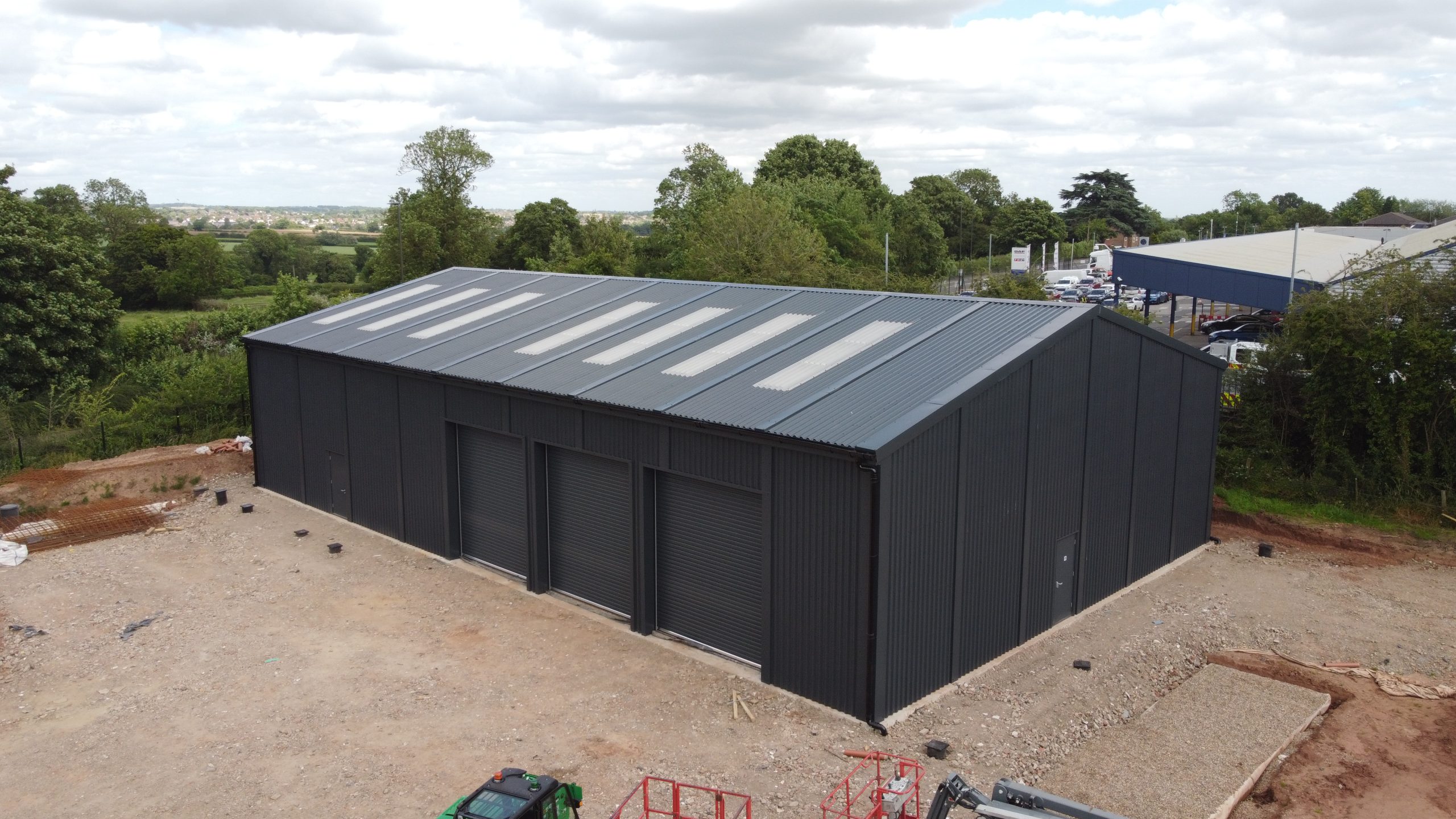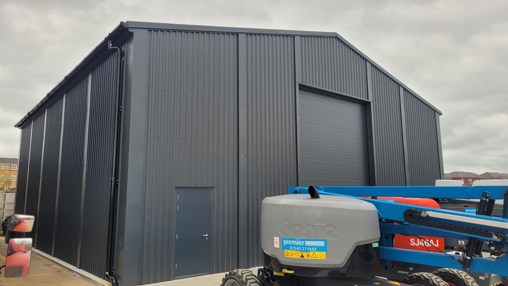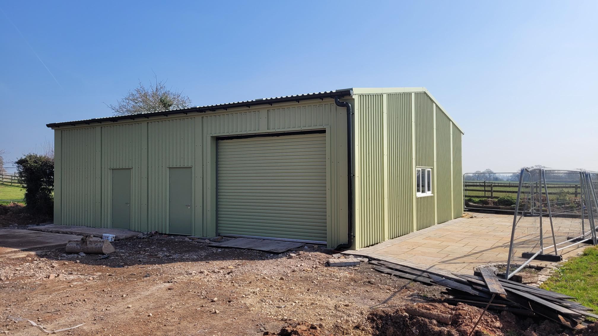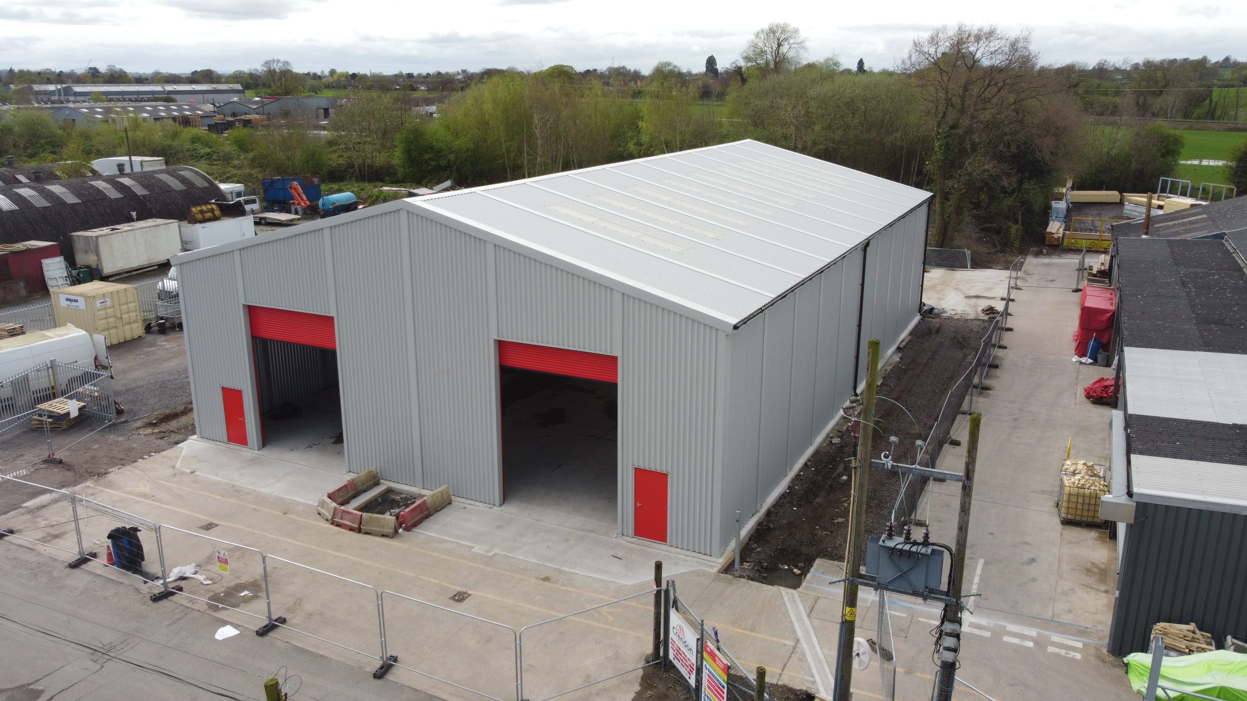 Prefabricated steel storage building with roller shutter and personnel doors installed in Staffordshire by Saredon Steel Buildings Ltd