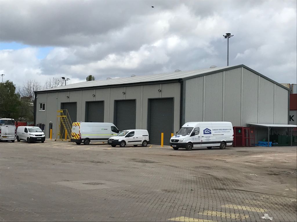 Large steel vehicle maintenance building in Birmingham for Suez Recycling and Recovery, manufactured by Saredon Steel Buildings Limited